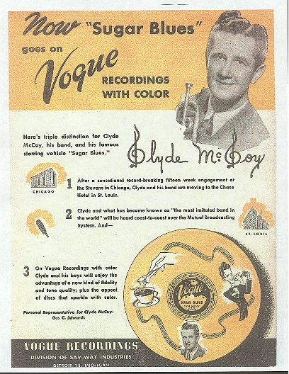 Sav-Way appears to have experimented with two different styles for the illustrations. The first style uses a solid-colored background with illustrations relating to the song at several places on the record, and a black-and-white image of the artist. The second style is very similar to what Sav-Way actually used in production; an image relating to the song that fills the entire background of the record, and a black-and-white image of the artist. A 1945 issue of "Down Beat" magazine contained an ad for Clyde McCoy's "Sugar Blues" on "Vogue recordings with color". This ad showed an artist's drawing of the record in the solid-colored background style (with a yellow background).